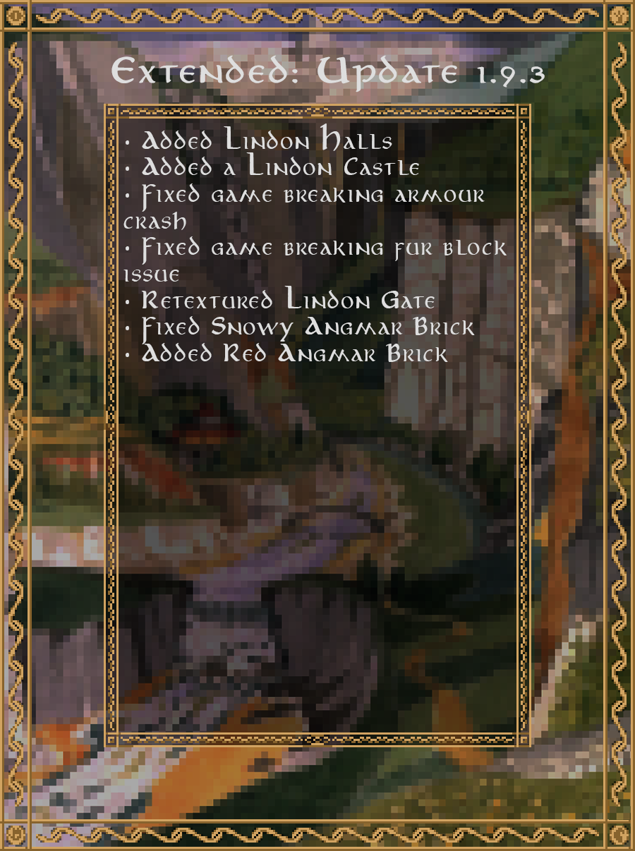 This small update's main purpose was fixing major issues and adding just a bit of content in the form of Lindon Halls, a Lindon Castle, and a few new Angmar blocks